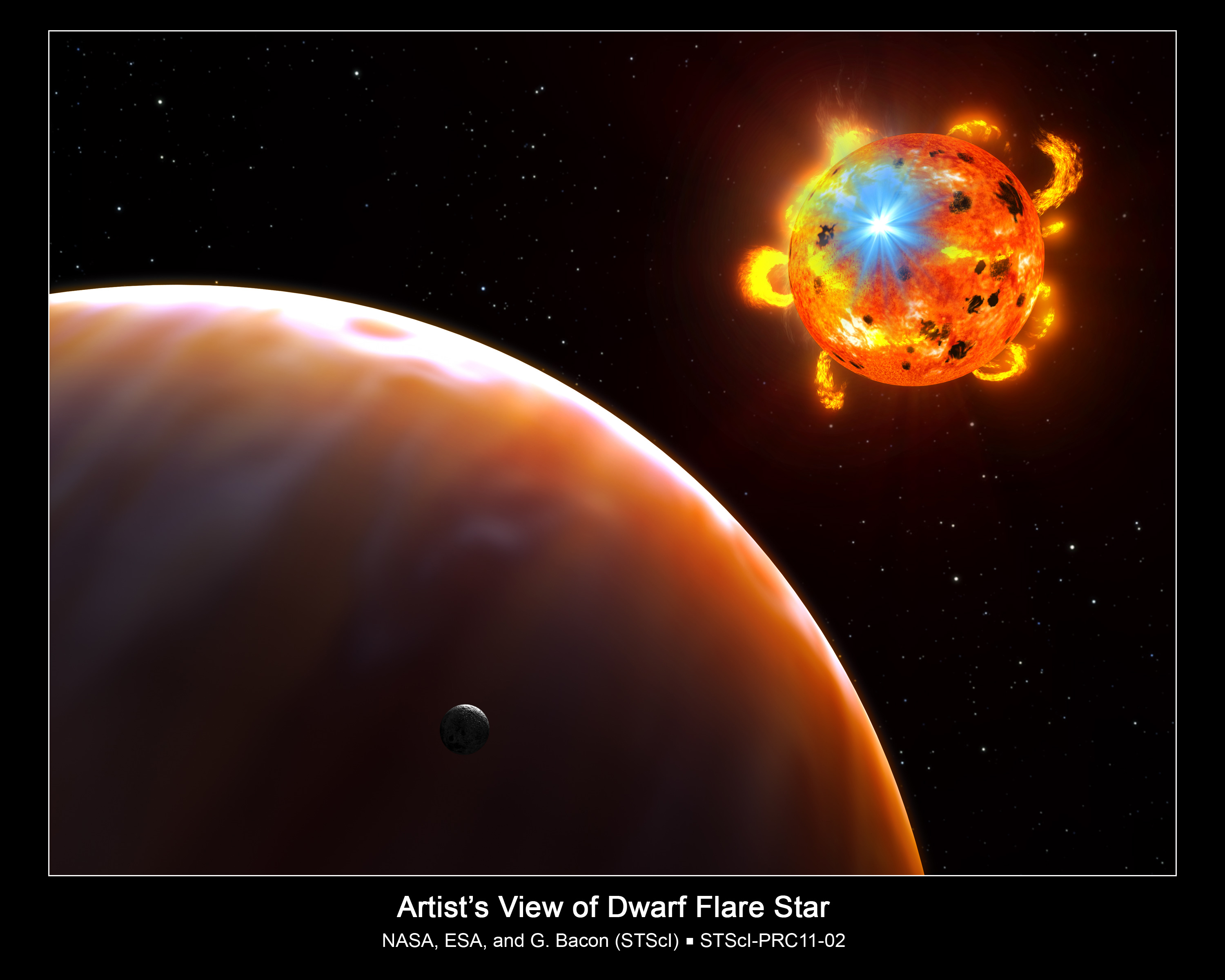 This is an artist's concept of a red dwarf star undergoing a powerful eruption, called a stellar flare. A hypothetical planet is in the foreground. Credit: NASA/ESA/G. Bacon (STScI)